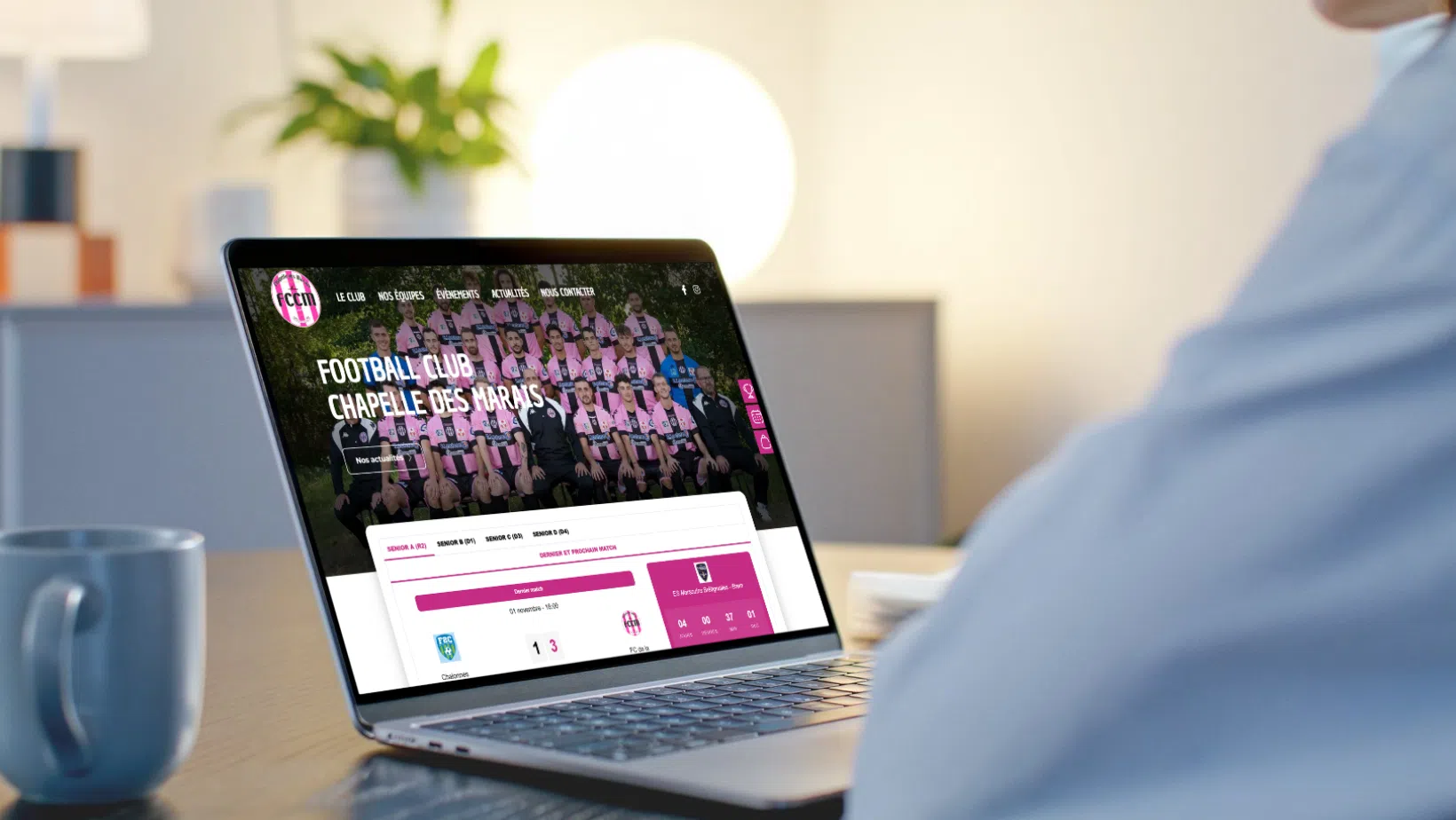 Dans un premier temps, nos équipes ont conçu une maquette sur-mesure pour le FCCM. Pensée dans l’esprit du club et fidèle également à son identité visuelle. Nous avons repris les couleurs emblématiques rose et noir, tout en privilégiant une mise en page moderne et dynamique qui reflète l’énergie et la convivialité du FCCM.